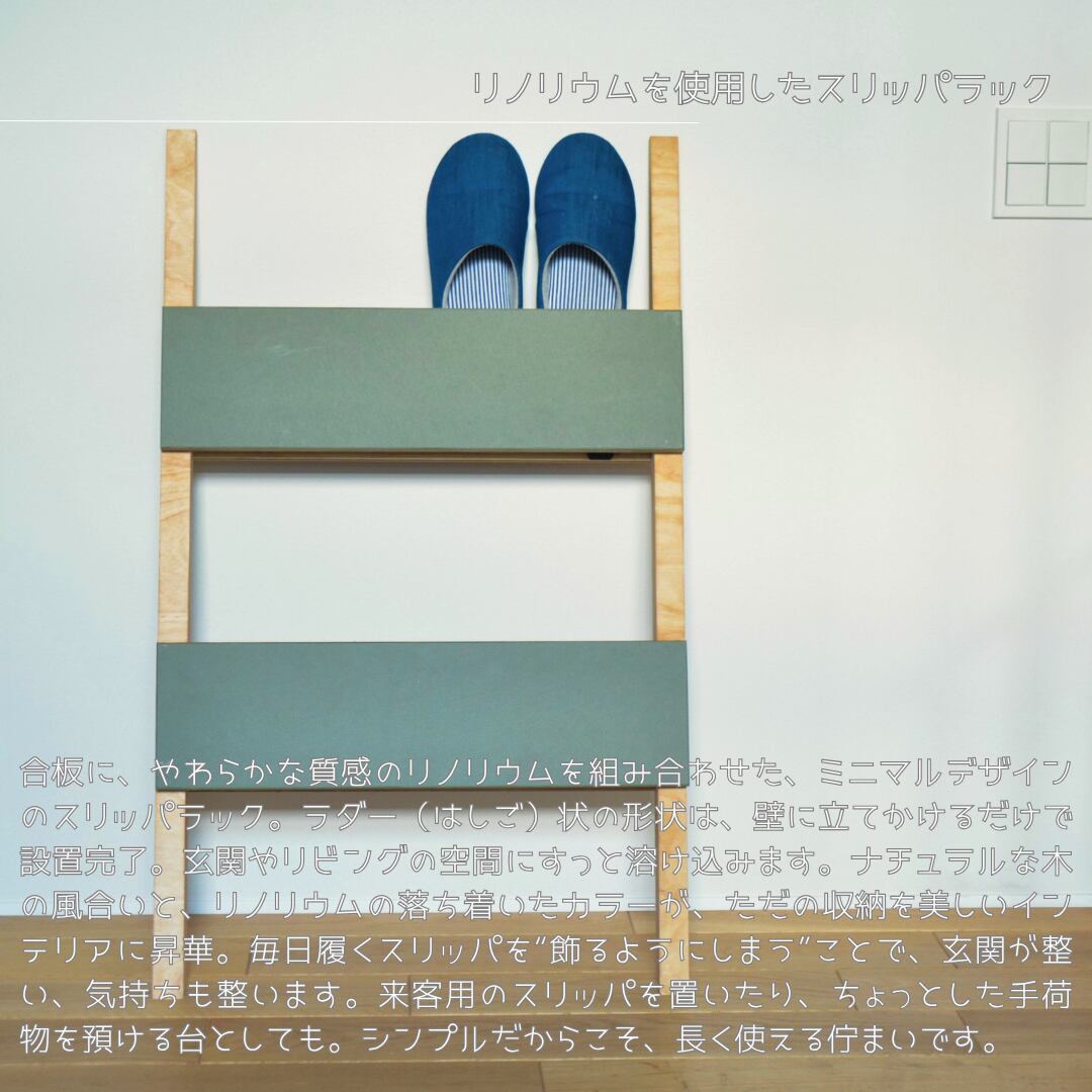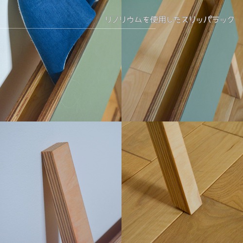 こちらのスリッパラックは、合板にやわらかな質感のリノリウムを組み合わせた、ミニマルデザインが特徴です。