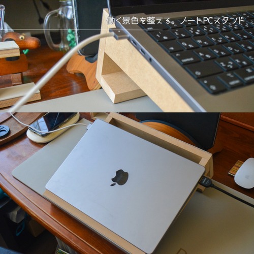 こちらは天然素材リノリウムを使用したミニマルで機能的なノートPCスタンドです。