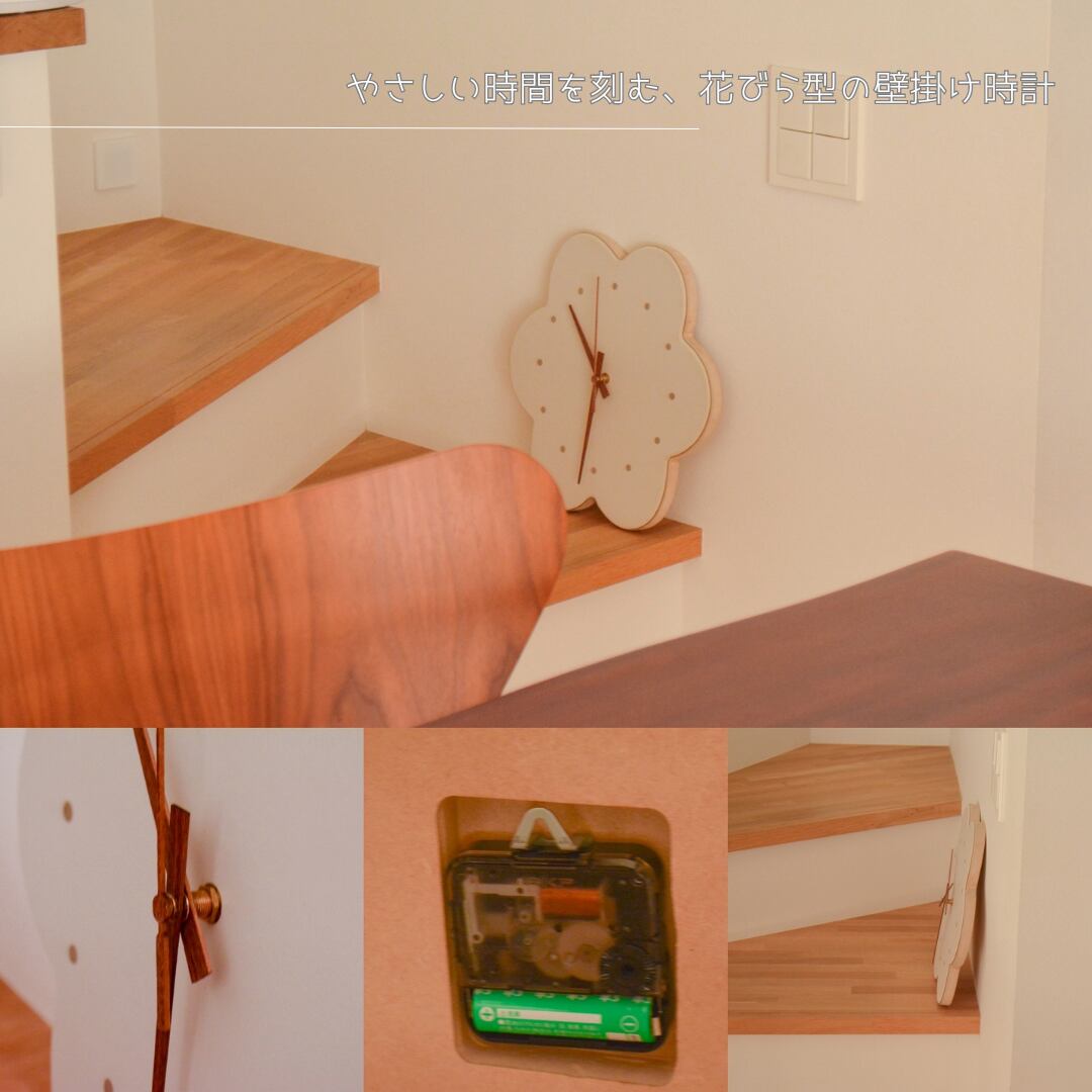 こちらはふんわりとした花びらのシルエットが印象的な、ナチュラルモダンな壁掛け時計。