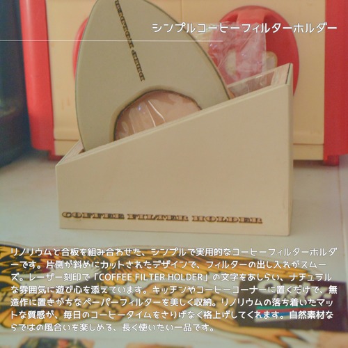 こちらはリノリウムと合板を組み合わせた、シンプルで実用的なコーヒーフィルターホルダーです。