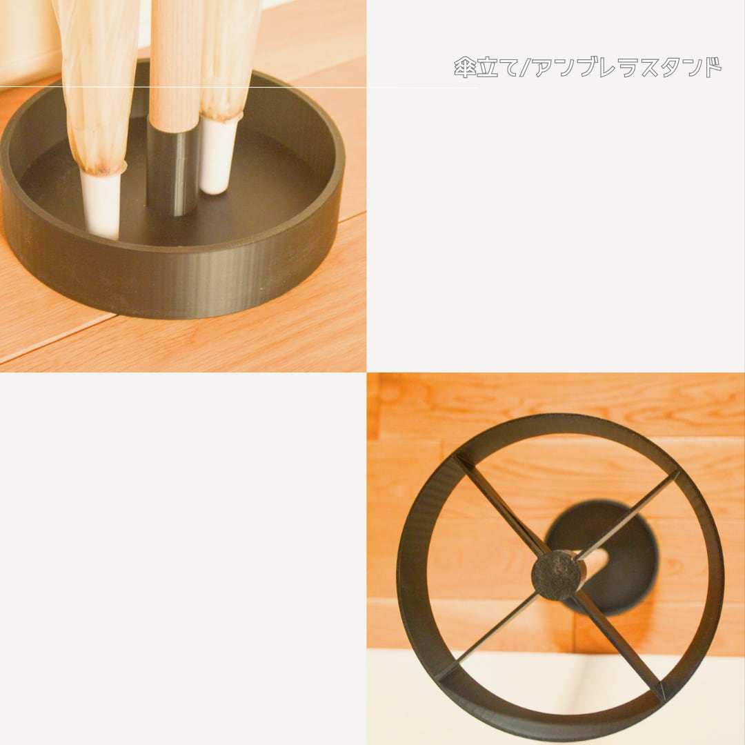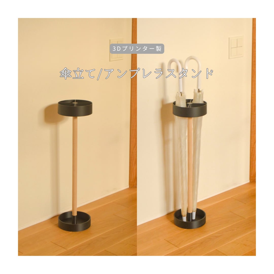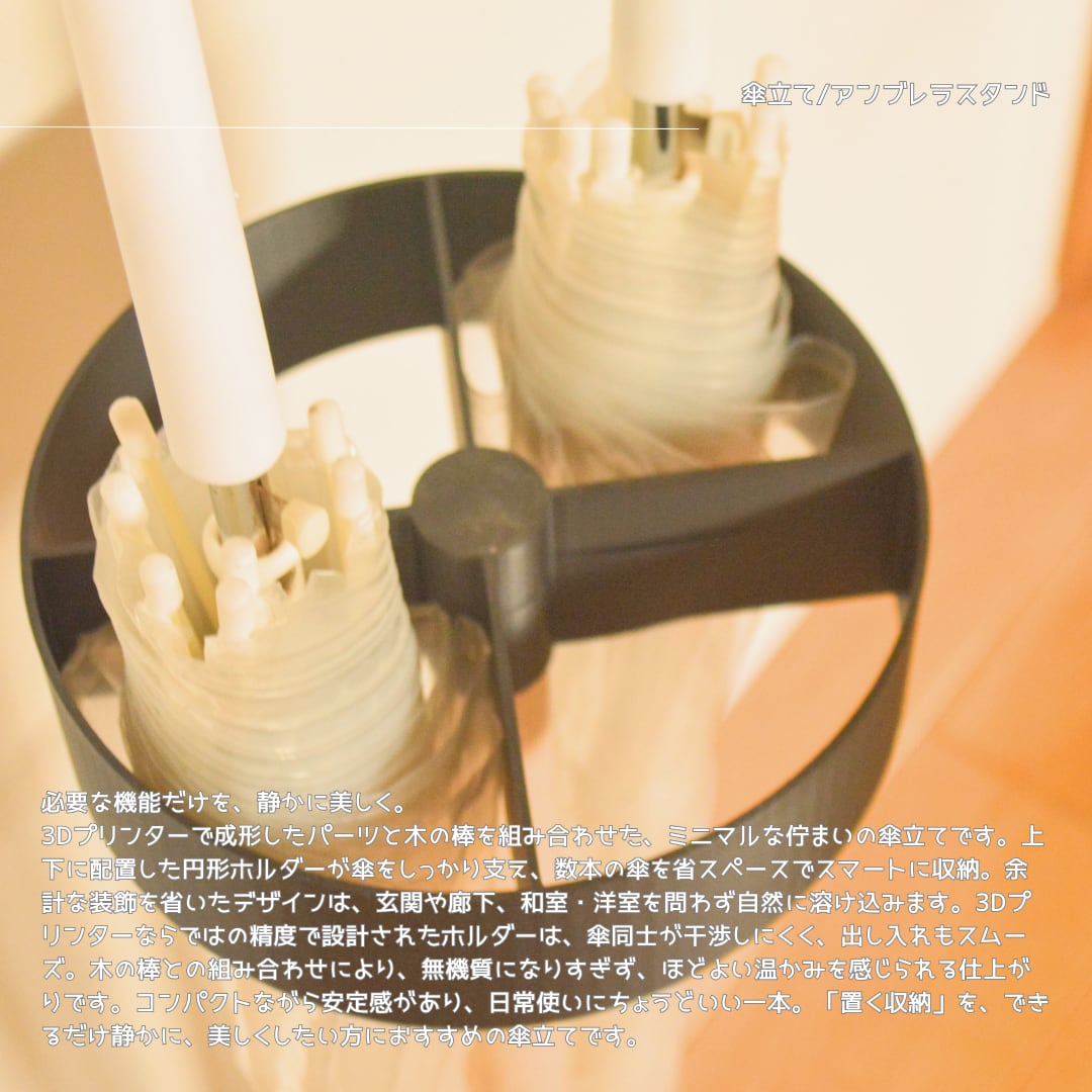 3Dプリンターで成形したパーツと木の棒を組み合わせた、ミニマルな佇まいの傘立てです。