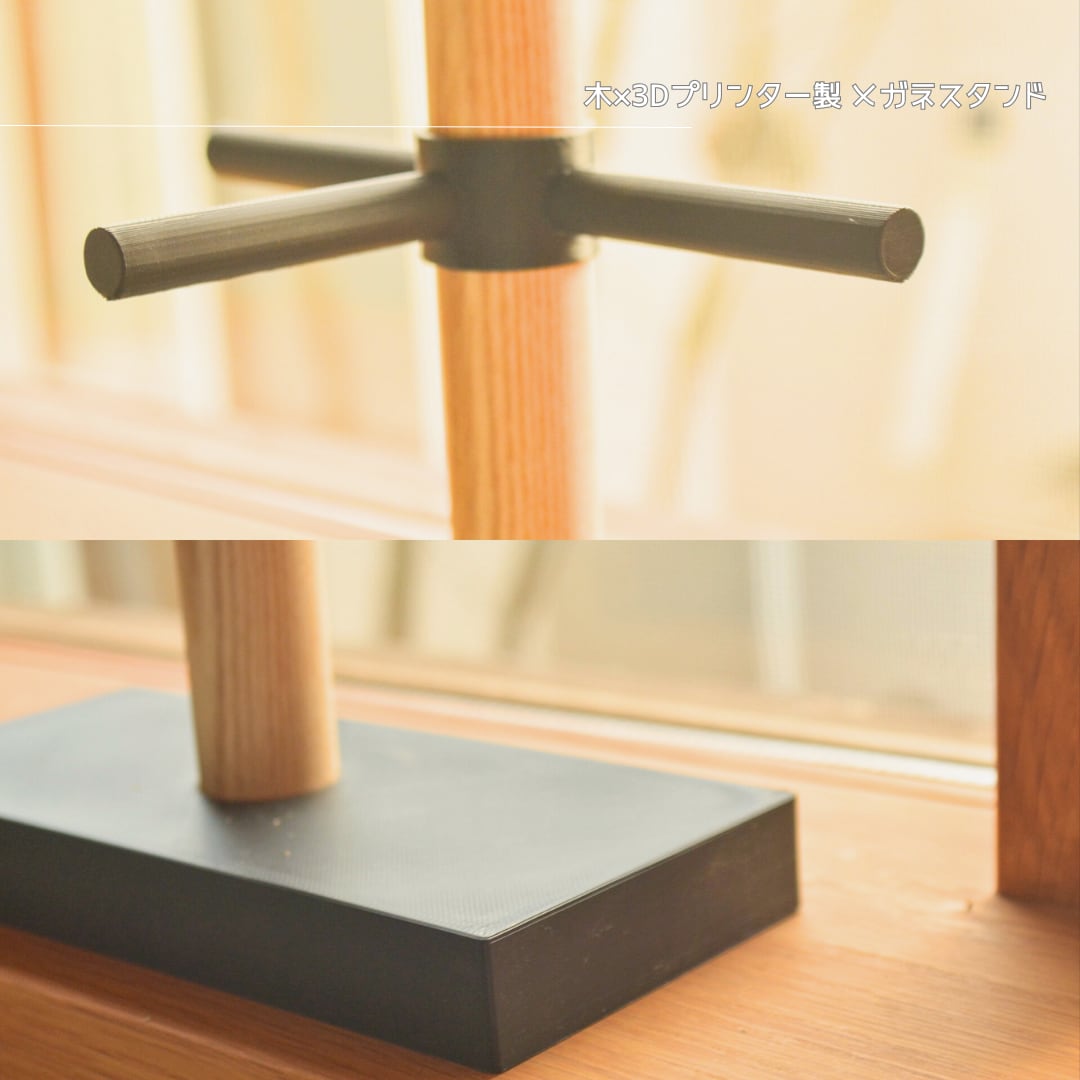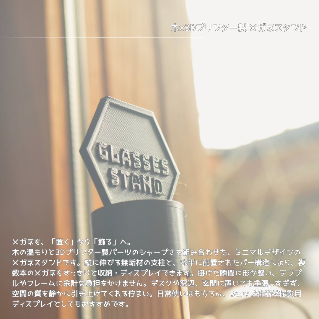木の温もりと3Dプリンター製パーツのシャープさを組み合わせた、ミニマルデザインのメガネスタンドです。